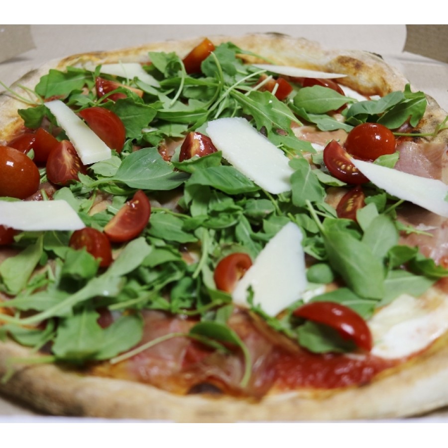 SOS DE ROSII, MOZZARELLA DE BIVOLITA, BUSUIOC, ROSII CHERRY, PROSCIUTTO CRUDO, PARMIGIANO, RUCOLA
